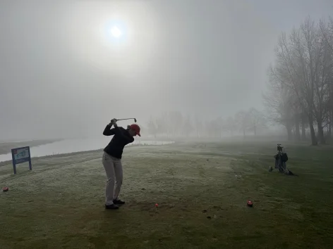 De morgenstond heeft goud in de mond, maar niks gouden aurora op 9 maart. Het is al 10:06 uur als Wilma van Vliet haar golfvriendin fotografeert op hole 15. Ze gingen om 9:00 uur de baan in op hole 10. Op die tijd was het niet ongevaarlijk, want het zicht was minder dan 60 meter. En die oranje ballen zag je net zomin als de witte. Afslaan met een ijzer dus. Normaal zou je denken dat de baan gesloten zou zijn en je hoeft ook niet te gaan, natuurlijk. Maar toch, het is een unieke ervaring als je op onze prachtige Golfbaan Hitland de zon ziet opkomen door de mist heen.