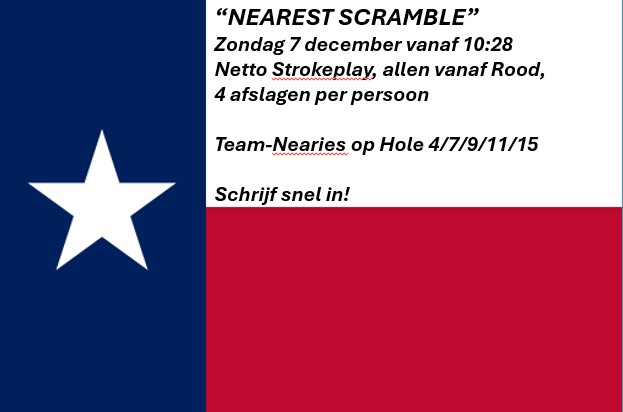 De Texas scramble op zondag 7 december, vanaf 10:28 uur, wordt gespeeld met het thema “5 Nearies”.