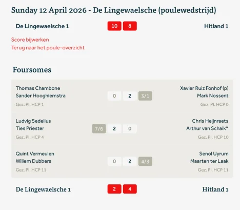 Gisteren zijn we begonnen op Golfbaan Kroonprins Vianen tegen GC de Lingewaelsche, die daar hun thuisbaan hebben. Ondanks dat onze tegenstanders individueel lagere handicaps hadden, stonden we na de foursomes knap met 4-2 voor.
