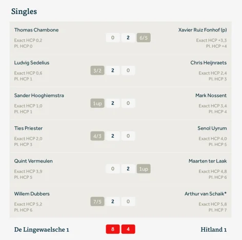 In de singles hebben we hard gestreden, maar lukte het net niet om de overwinning of een gelijkspel binnen te halen. Maarten pakte een mooie winst op de laatste hole. Mark stond 2 up, maar zag zijn tegenstander op de laatste vijf holes drie birdies maken en verloor daardoor alsnog op de laatste hole.