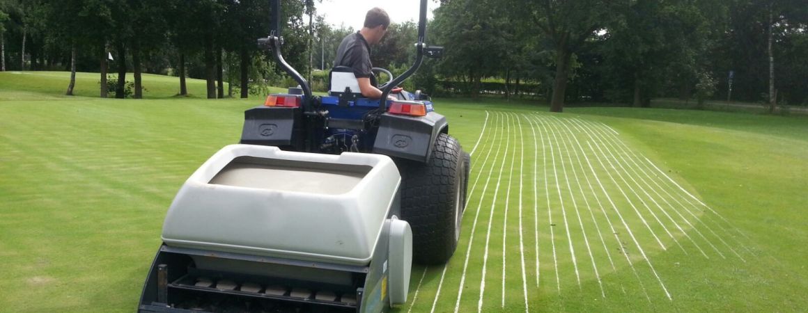 In de fairways worden gaatjes geprikt voor de verbetering van de afwatering en het stimuleren van de wortelgroei van het gras.