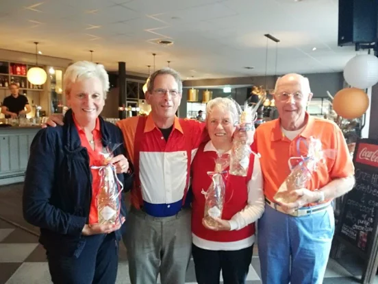 Na de gespeelde 18 holes kwam de teamprestatie aan de orde en onder het genot van een drankje, (door de commissie geschonken), werden de scores van de spelers van het team per hole naast elkaar gezet. Van de 4 scores per hole telden de 3 beste. Deze scores bij elkaar opgeteld bepaalde het winnende team, dat als prijs een mooie fles prosecco ontving. Al met al een bijzonder geslaagde en gezellige dag, prima georganiseerd.