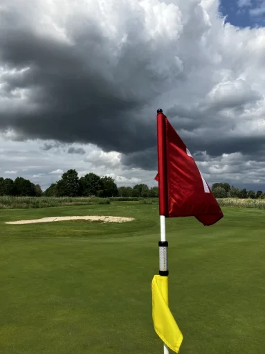 'Op de vrijdag van de KLM open werd bij Amsterdam het spel stilgelegd vanwege de weersomstandigheden. Op Hitland werd de Ballenlawine gewoon afgewerkt in soms stormachtige omstandigheden. Dit gaf ook mooie Hollandse luchten. Hier te zien op hole 7 met zicht op de nieuwe teebox.'