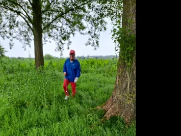 Het blijft maar regenen maar geen foto’s, deze keer is er een ballenzoeker c.q. een oeverinspecteur op de foto gezet bij hole 13. Een zeer bekende golfer in de kleuren rood, wit en blauw.