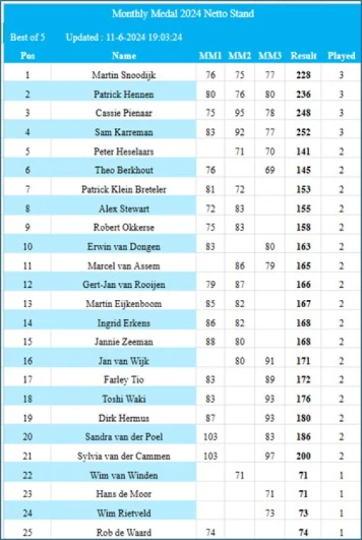 De volgende wordt gespeeld op 29/6, dus nog vier te gaan, voor de "beste 5" als klassement Bruto en Netto, dus ook gewoon voor wat gezellige rondes!