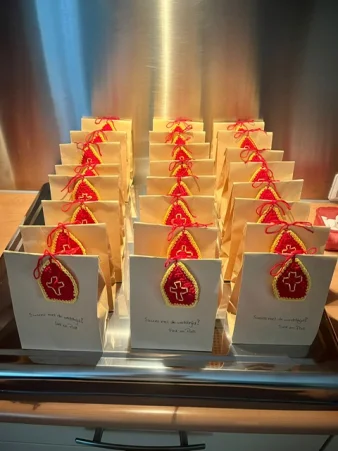 Marian was creatief bezig geweest en had voor iedere deelnemer een zakje pepernoten met daarop een gehaakte mijter van de Sint.