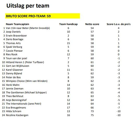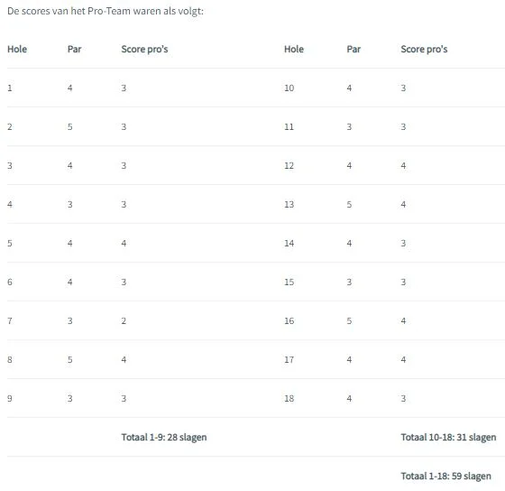 Met 10 birdies en 1 eagle heeft het Pro-Team wederom een mooie bruto score van 59 neergezet. Wat als ook die wat langere puttjes nog waren gevallen...?