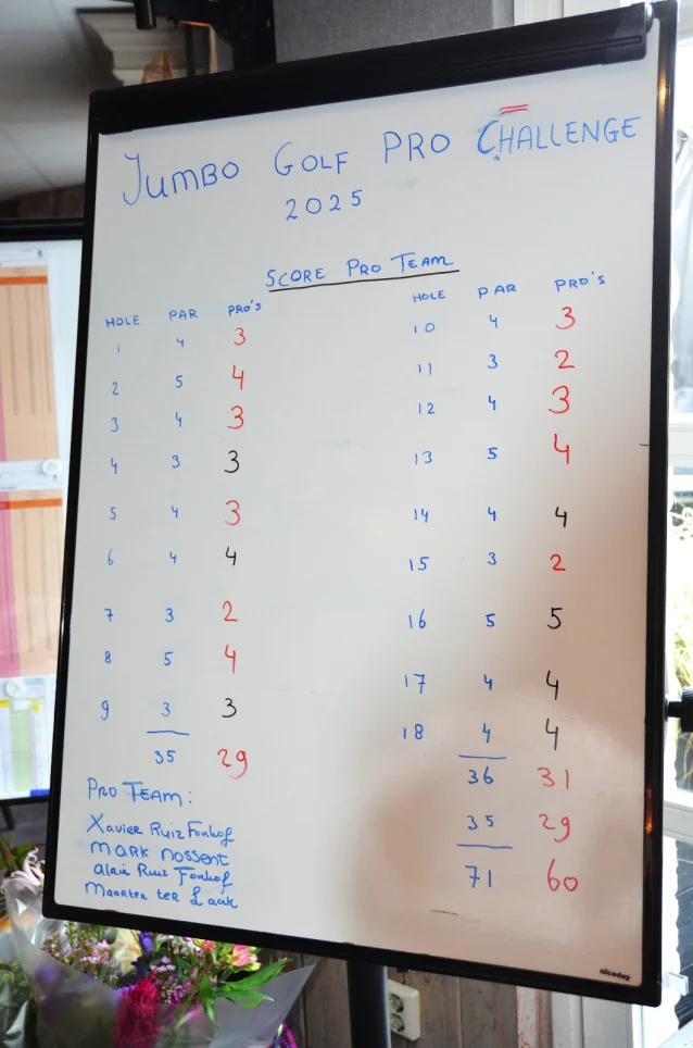 Dus na de koffie met appeltaart mocht iedereen gaan lopen naar de starthole. Er werd ondanks de zware condities goed gespeeld. Het Pro-team met Xavier, broer Alain, Clubkampioen Maarten en Heren-1 speler Mark speelden in weer en wind 11 birdies en 7 parren, dus bruto 60. Geen record, maar ja: die wind héh..