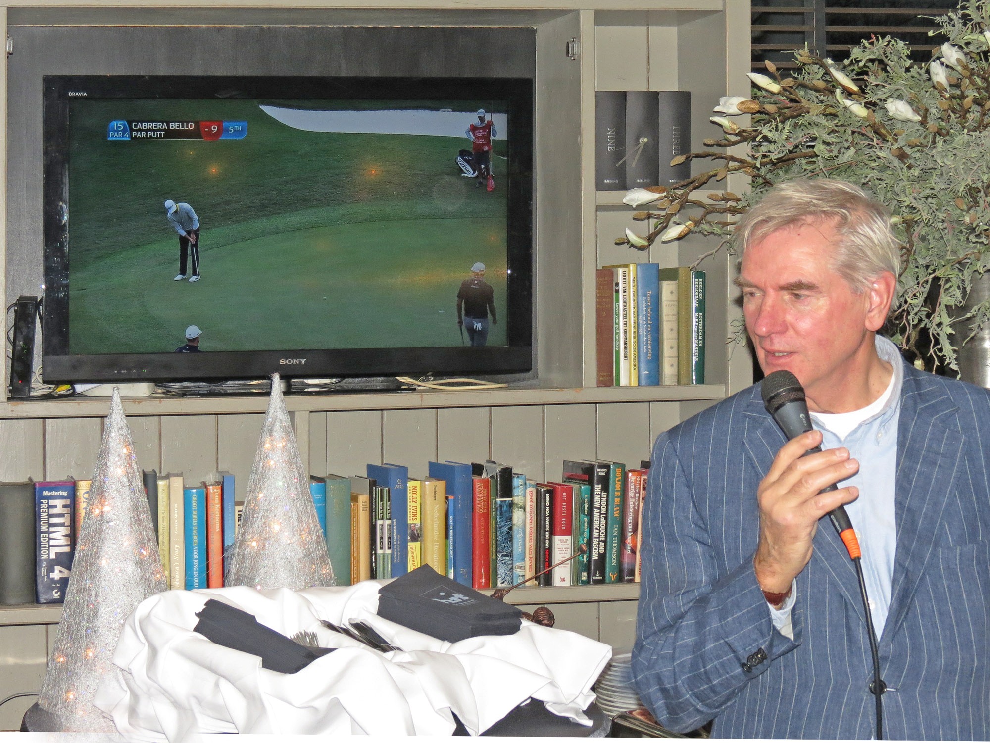 Tussen de gangen door kwam Wim nog aan het woord en memoreerde de twee in dit jaar overleden golfers, wijdde een beschouwing aan onze welvaart die zo schril afsteekt tegen een groot deel van de wereld elders (bijvoorbeeld Benin in West Afrika) en sprak de hoop uit dat we in 2018 onze gemiddelde handicaps gaan verbeteren (!). En dat de commissie er 2 leden bij mag krijgen . . . . . .
