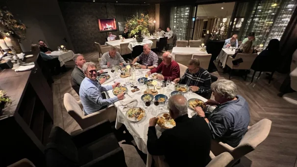 Vrijdag 29 maart was onze eerste dag en wij ontmoeten elkaar bij Golfclub De Semslanden in het hoge Noorden. De baan ligt op de grens van Groningen en Drenthe, de twee lussen van de18 holes wedstrijdbaan weerspiegelen de verschillen. De Hondsrug ligt op het zand en ademt de sfeer van het Drentse bos – en coulisselandschap. De lus Boerveen neigt naar het Hunzedal en het Groningse veen, en heeft een meer open karakter. De beide lussen zijn speltechnisch zeer gevarieerd. Uitdagend door lengte en hindernissen, maar veelal vergevingsgezind. Een schitterende baan waar de meeste teamleden nog niet hadden gespeeld. Een afwisselende baan die uitstekend was onderhouden. Mooie eco – zones langs de fairways. De baan is vrijwel altijd bespeelbaar. De Hondsrug is een soort zandwal die werd gevormd tijdens de laatste ijstijd, even terug in de tijd. Hoewel de lucht er donker uitzag bleef het heel de dag droog. Na afloop een drankje in het clubhuis en de bekendmaking van de winnaar van de dag Martin de captain had de beste score maar er kwam nog een dag dus er kon nog van alles gebeuren. Na de borreltijd op weg naar Hotel Ten Cate in Emmen. Na het douchen en omkleden nog een stukje meegemaakt van de vrijdagmiddag borrel. Bij het diner stond een verassing viergangenmenu op de agenda, De meeste van de teamleden zijn culinair wel iets gewend maar deze avond stond volop in het teken van de kwaliteit van het diner. Klasse en nog eens klasse. Na het diner bleven er wat teamleden over die nog een afzakkertje gingen halen bij de bar, de meeste golfers waren stuk voor stuk behoorlijk moe en zochten hun kamer op.