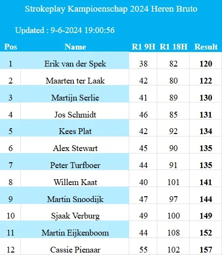 Hierbij de tussenstanden van het Strokeplay kampioenschap 2024, na dag 1 (9-06-2024).