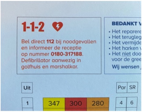 De centralist aan de telefoon kan u de juiste instructies geven en de spoedeisende hulp in gang zetten. - Geef duidelijk aan 112 waar je je bevindt, Golfbaan Hitland / waar op de golfbaan en dat de persoon niet aanspreekbaar is of pijn heeft. Vraag 112 ook om naar Golfbaan Hitland te bellen om z.s.m. hulp te krijgen van o.a. de Marshal. De Marshal heeft altijd een AED defibrillator in zijn buggy.