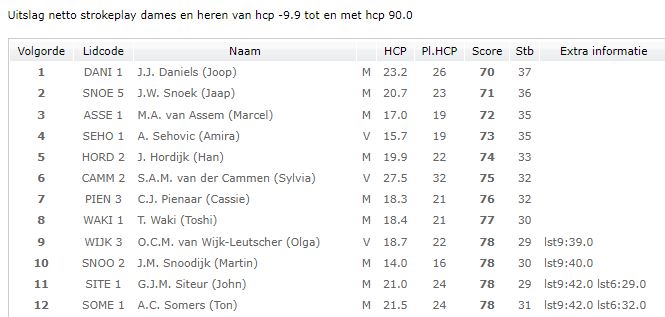 Onderaan tref je de top-10 netto scores van die dag. Joop bleef Jaap met 70 netto één slag voor en ook Marcel en Amira deden goede zaken voor het klassement. De beste bruto was voor Marcel van Assem (91 slagen).